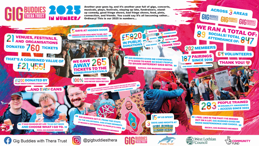 Since 2016 we’ve now created 187 pairs of Gig Buddies and there’s currently 64 pairs of Buddies getting out with each other every month on top of all the other friendships that have been created through gig buddies, as well as all of our group events. We’ve also given away more tickets to events across Scotland than ever before. Over 750 tickets were donated from over 20 venues, festivals and all round cool people!